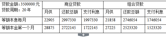 以贷款350万、20年为例,将商业贷款与组合贷款对比如下: