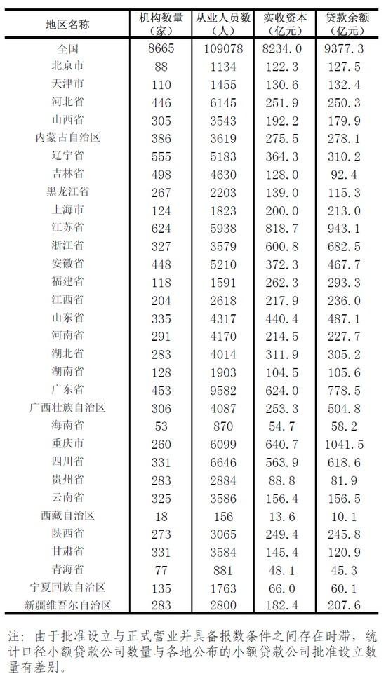 从央行官网获悉,近日,人民银行发布2017年一季度小额贷款公司统计数据报告。报告显示,截至2017年3月末,全国共有小额贷款公司8665家,小额贷款从业人员总数量为109078人,小额贷款实收资本8234亿元,贷款余额为9377.3亿元。