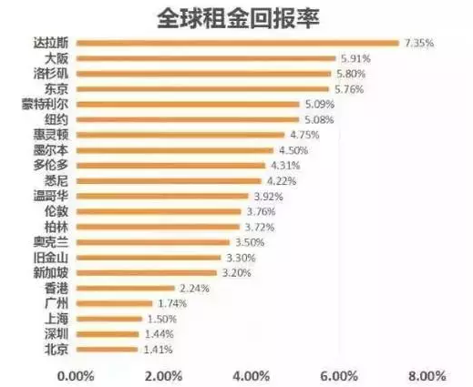 一般来说,5%以上的租金回报属于适合投资的楼市。从数据来看,美国的达拉斯、洛杉矶、纽约,日本的大阪、东京都有不错的表现,租金回报率达到5%以上,相比之下,中国一线城市北上广深,租金回报率就比较低了,仅1.5%左右。