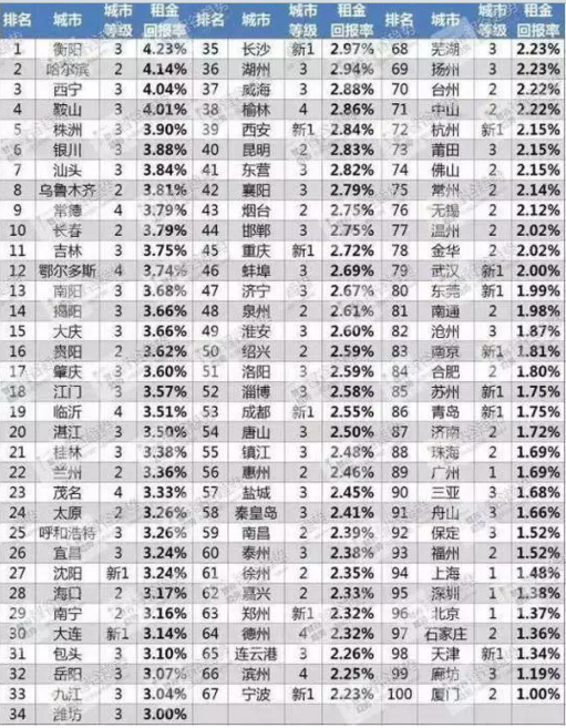中国城市的租金回报率普遍较低,一般规律:城市越大租金回报率越低,在租金回报率排名前10的城市中,没有一个一线或者新一线城市,二线城市只有3个,三、四线城市占到了70%,不过,即便排名第一的衡阳(回报率为4.23%),相比上述国际都市也没有优势