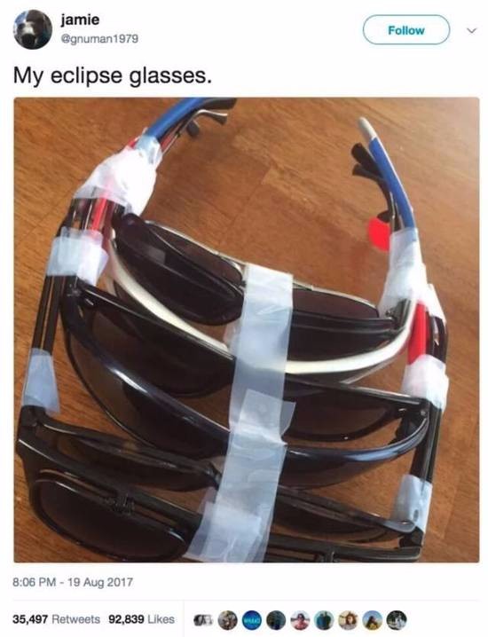虽然眼镜如此脱销,也没办法阻挠美国人民观看日全食的热情,因此他们开始动用了智慧,表示”买不着,老子可以自己做!”五花八门的眼镜就这么”问世”了。