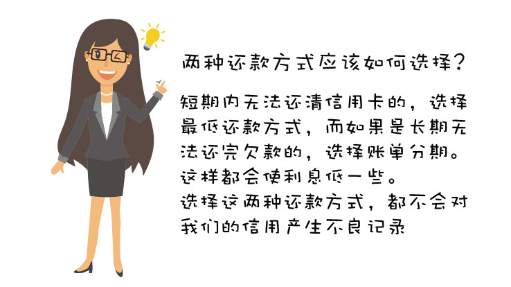 所以 ,短期内无法还清信用卡的,选择最低还款方式,而如果是长期无法还完欠款的,选择账单分期。这样都会使利息低一些。期还款一般对金额较大、较长时间内无法一次性还款的持卡人较为有利。如果账单金额较低、消费记账日距离最后还款日较近,选择先归还最低还款额的方式比较省心。