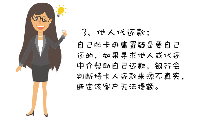 自己的卡自己还,若是经常关顾外面的代还中介,由他人的卡转入还款,那么银行会判定持卡人的还款来源不真实,判定持卡人无法提额。