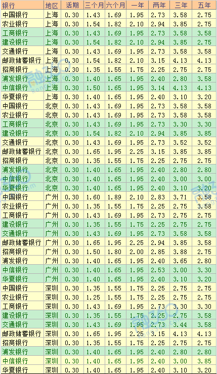 下面我们来看看2019银行柜台实际挂牌存款利率是多少,同一家银行在不同地区的存款利率也有可能不一样。由于全国城市太多,下面融360小编整理了北上广深一线城市不同银行的2018年底存款利率,见下表。