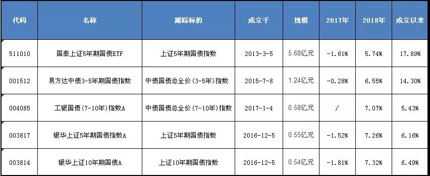 老娘舅把成立于2018年之前、规模大于5000万的国债指数产品做了一个罗列——