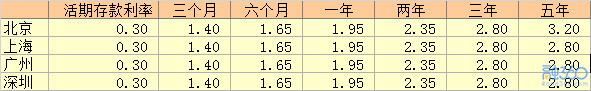 我们可以发现,2019年北上广深的存款利率几乎都是一样的:活期存款利率都是0.3%;三个月期的存款利率都是1.4%,六个月期的存款利率都是1.65%;一年期存款利率都是1.95%,两年期的存款利率都是2.35%,三年期的存款利率都是2.8%;