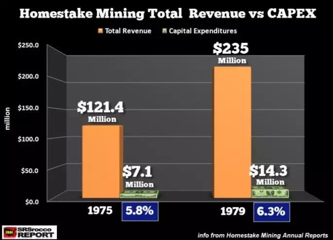 在1979年,美国最大金矿 HomestakeMining 资本支出仅占营收的6%。那已经是HomestakeMining 资本支出相对较多的一年,因为那一年金价较高。但是后来,尽管金价涨到新的高度,资本支出并没有太大的变化。