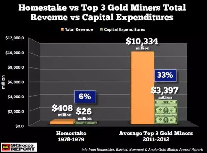 若拿1978-1979年与2011-2012年对比,Barrick, Newmont 和 AngloGold 等三家第一梯队的金矿资本支出最高达到33%,达到103亿美元,即营收的三分之一都用作资本支出。是Homestake Mining 当年6%的资本支出的5倍。
