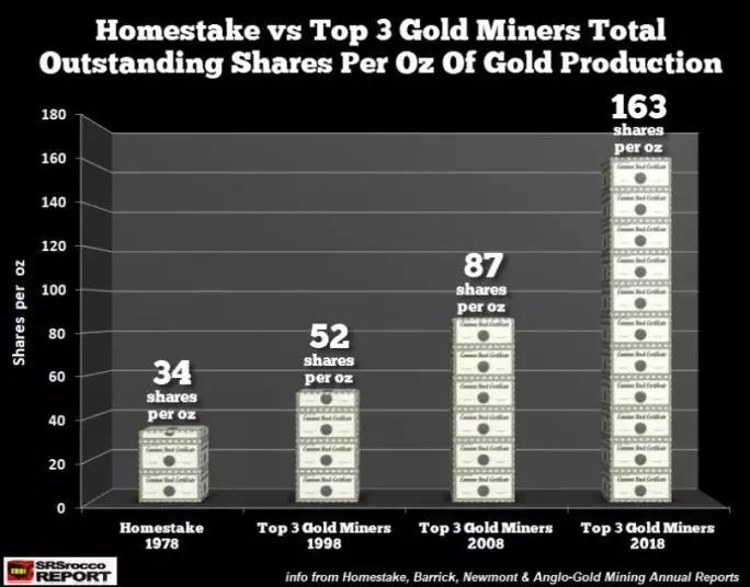 以TOP 3 黄金矿商为例,在1978年,那么生产一盎司黄金只需要34股公司股票。然而,20年后的1998年,在前三大黄金矿商中,黄金产量增加至每盎司52股。