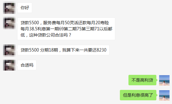 马先生去年在某消费金融公司申请了一笔贷款,贷款5500元分期18期,算下来一共要还8230元,他私信问我这种贷款合法吗?