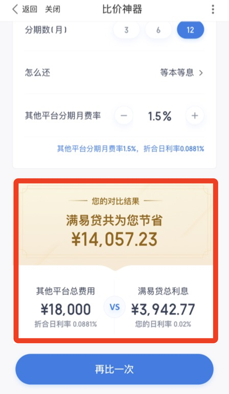 另外,想要知道自己的贷款成本高不高,可以使用有钱花“比价神器”进行比价,该功能支持不同贷款在不同还款方式下贷款成本的计算,还能计算出实际的日利率,对比贷款成本,帮你挑选更省钱的平台。