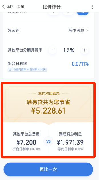 用户在申请贷款时会遇到不同还款方式的贷款产品,由于利率的表达方式往往不一样,比如说有:日息万分之五、月费率1%等等,因此很难比较出几款产品究竟哪款更省钱。有钱花推出的比价神器可以帮我们解决这个问题。通过比较,就能很直观的了解到对比产品的息费明细,帮助我们做决策。