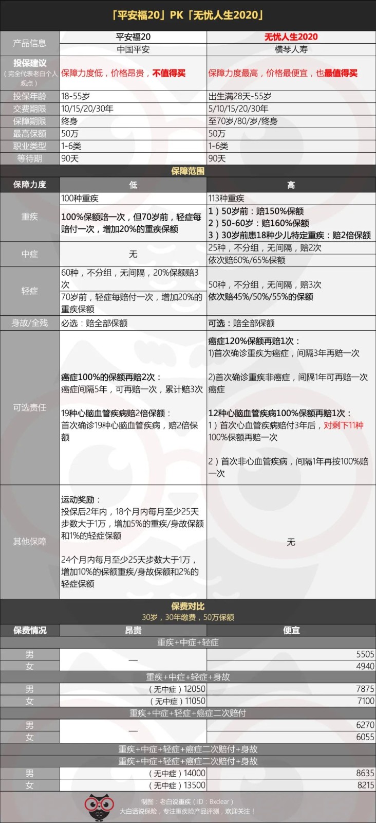 比如小公司横琴人寿的「无忧人生2020」(曾经性价比最高)和平安最新的「平安福20」对比。