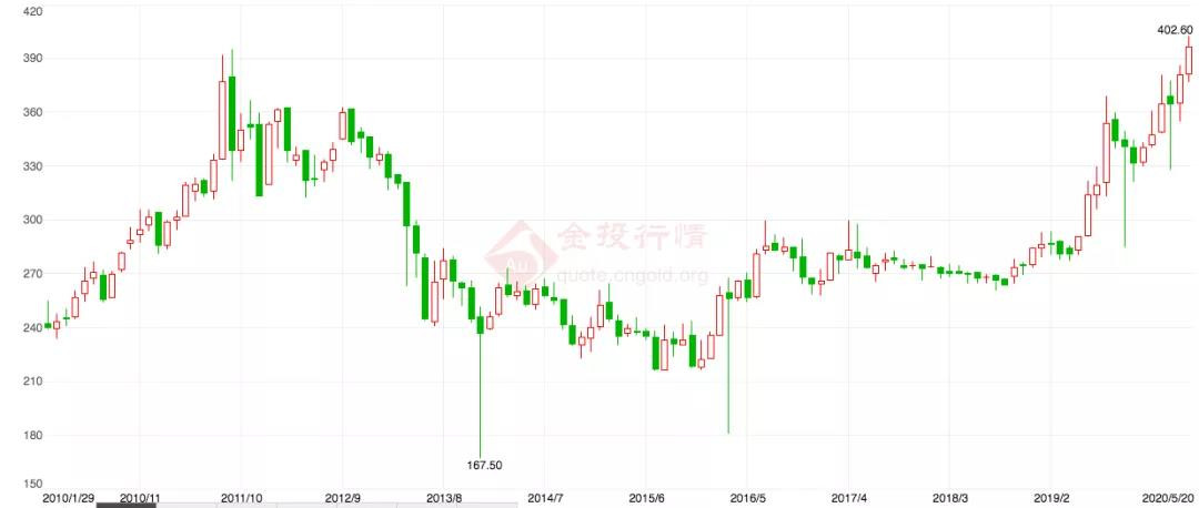 上面那张图是黄金9999的走势行情,按照最近10年的推算,从2010年5月大约260左右,算是一个便宜的价格,到现在的400元,上涨了140元/g,收益率是53.8%。