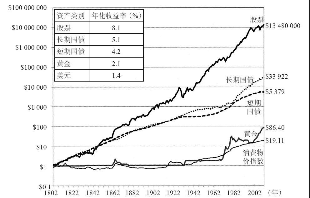 在《股市长线法宝》一书中,西格尔教授做过一个数据回测,从1802年到2002年,200年间,经历过第一次世界大战、第2次世界大战、大萧条、金融危机等,最终黄金的年化收益率是2.1%。