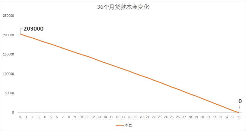 在刚开始的时候贷款本金是203000元,但到36个月之后,剩余贷款余额是0。