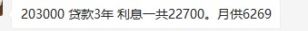这条车贷信息,总贷款203000元,月供6269元,36个月一共225684元,扣除本金后总利息22684元。