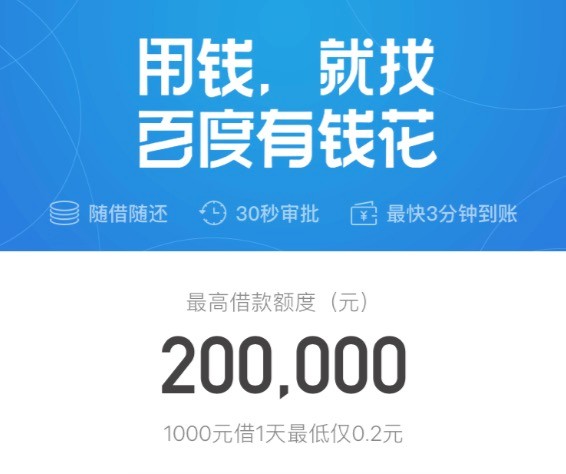 “有钱花”,是百度信贷服务品牌,提供面向大众的个人消费信贷服务,打造创新消费信贷模式。有钱花是百度信贷服务,由百度及合作机构提供,满足您的日常消费周转的资金需求,为您量身定制的现金贷服务。利用百度人工智能和大数据风控技术,为用户带来方便、快捷、安心的互联网信贷服务,具有申请简便、审批快、额度高、放款快、安全性强等特点。